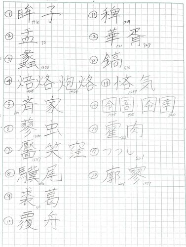 ①心正しければ則ちボウシ瞭らかなり ②君はウの如く、民は水の如し ウ・・・はち(鉢)。 ③管を以て天を窺いレイを以て海を測る ④ホウロク千に槌一つ ホウロク・・・平たい素焼きの土鍋。 ⑤修身セイカ治国平天下 ⑥リョウチュウ辛を忘る ・・・人の好みはさまざまであるこ…