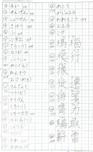 ①〜⑤ 音読み ①哀惜の念に満ちた「誄」 ②怠け者が「譫言」をほざく ・・・うわごと。 ③徐に「摺扇」を開く ・・・折り畳める扇。 ④箱根は「亟遊」の地である ・・・しばしば行くこと。 ⑤「缶」を打って拍子をとる ・・・口をつぼんだ素焼きの器。ほとぎ。 ⑥〜⑧ 訓読み ⑥小閣「衾」を重…